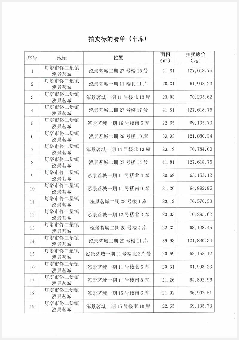 另有:①土地使用權(quán)及工廠廠房廠地場地工業(yè)園等房地產(chǎn)類②辦公樓住宅公寓別墅門市網(wǎng)點車庫商鋪檔口賓館酒店學(xué)校村舍等房產(chǎn)類③非農(nóng)建設(shè)用地和農(nóng)用地等集體土地使用權(quán)及地上建筑物及建筑附屬物④機(jī)器設(shè)備車輛玉石等物資類⑤林地林木林權(quán)類⑥金融機(jī)構(gòu)閑置資產(chǎn)等。共計五百余項資產(chǎn)公開推介,以上資產(chǎn)均有瑕疵。起拍價保留價以委托方通知公布為準(zhǔn)。詳情參考本公司網(wǎng)站www.lnjhpm.cn或到本公司查閱拍賣標(biāo)的明細(xì)及拍賣文件。