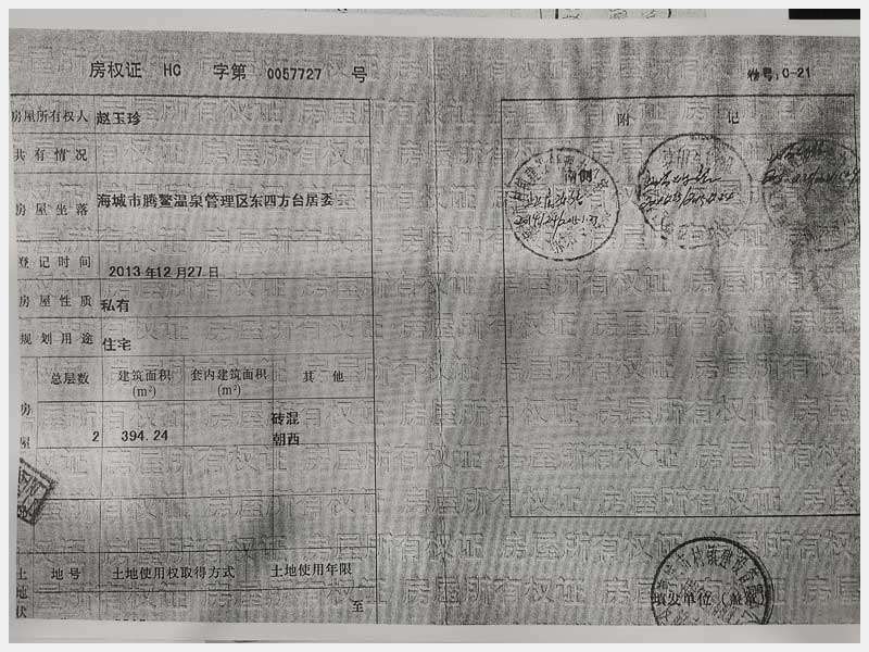 名稱:海城市騰鰲溫泉管理區(qū)東四方臺居委會房產(chǎn) 面積:394.24㎡ 瀏覽次數(shù):1311