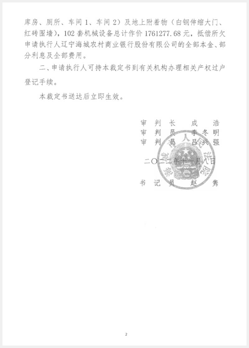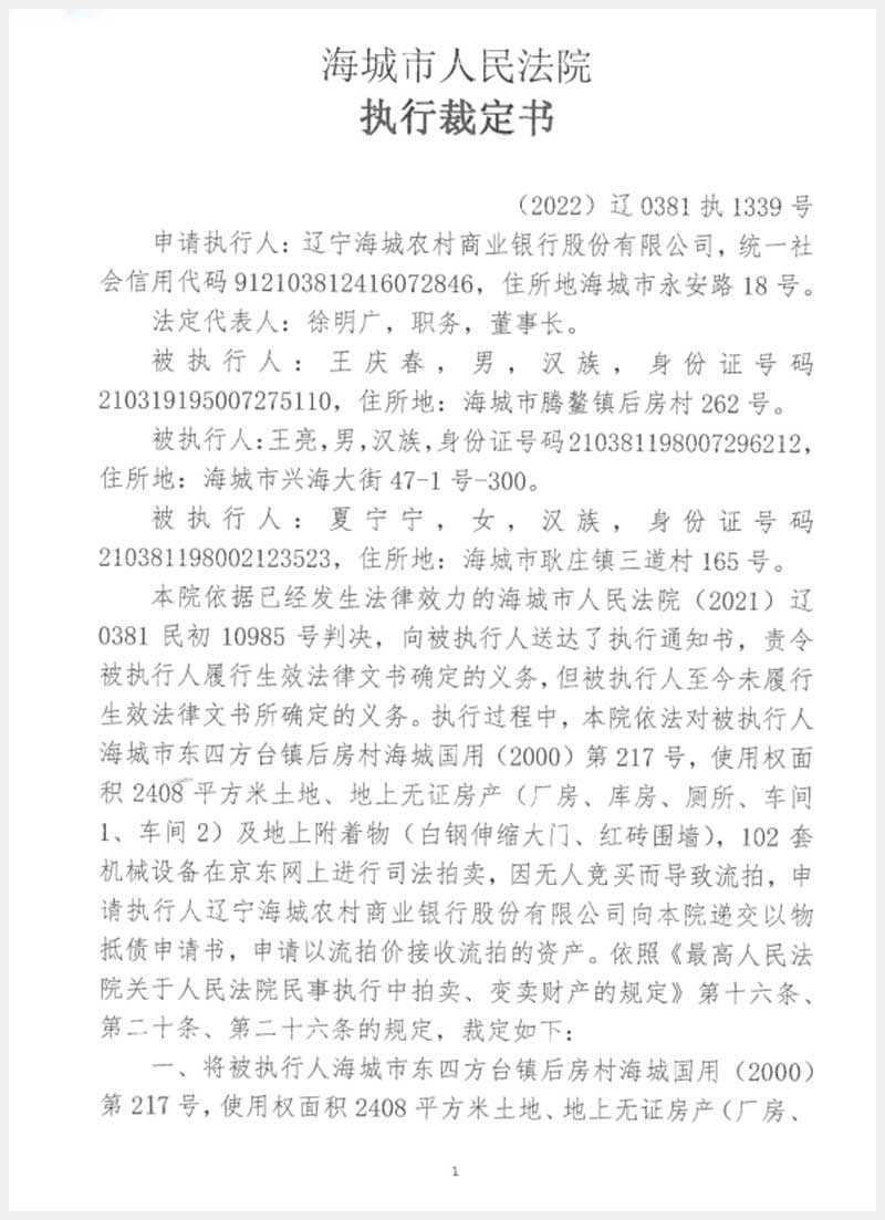 251號 海城市東四方臺鎮(zhèn)后房村房產(chǎn)、土地使用權(quán)及機器設(shè)備