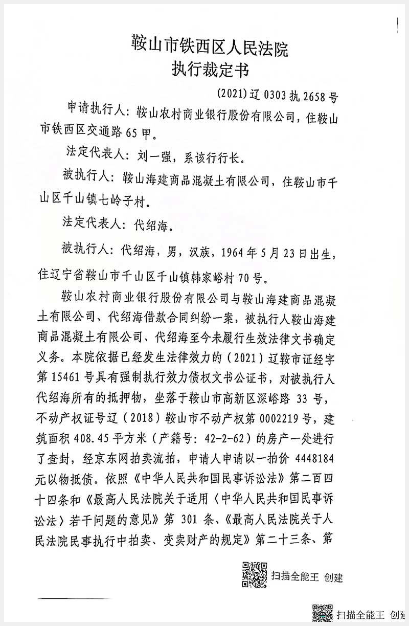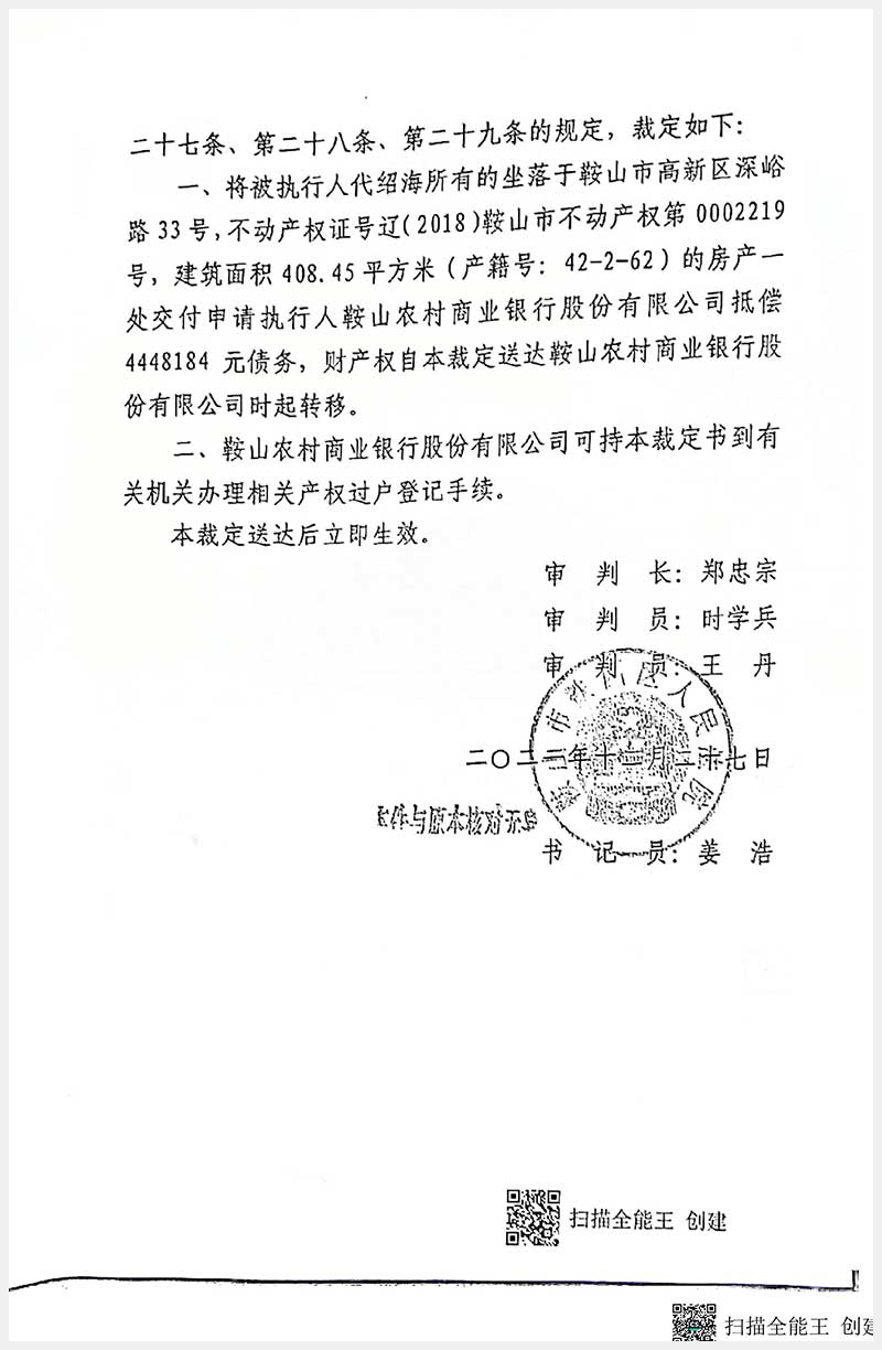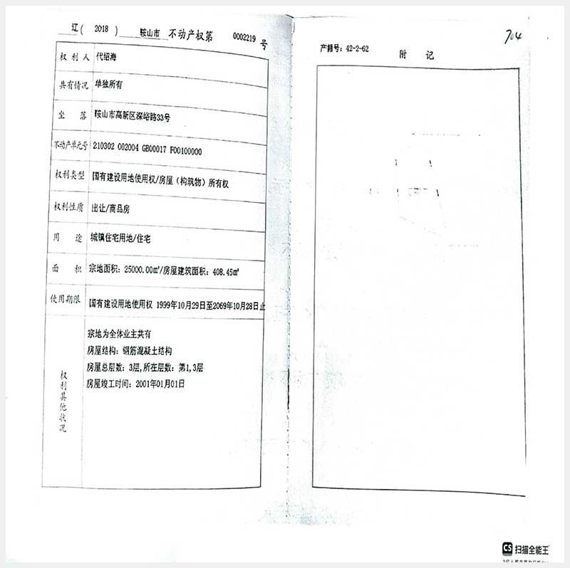 名稱:鞍山市高新區(qū)深峪路33號房產(chǎn) 面積:408.45㎡ 瀏覽次數(shù):279