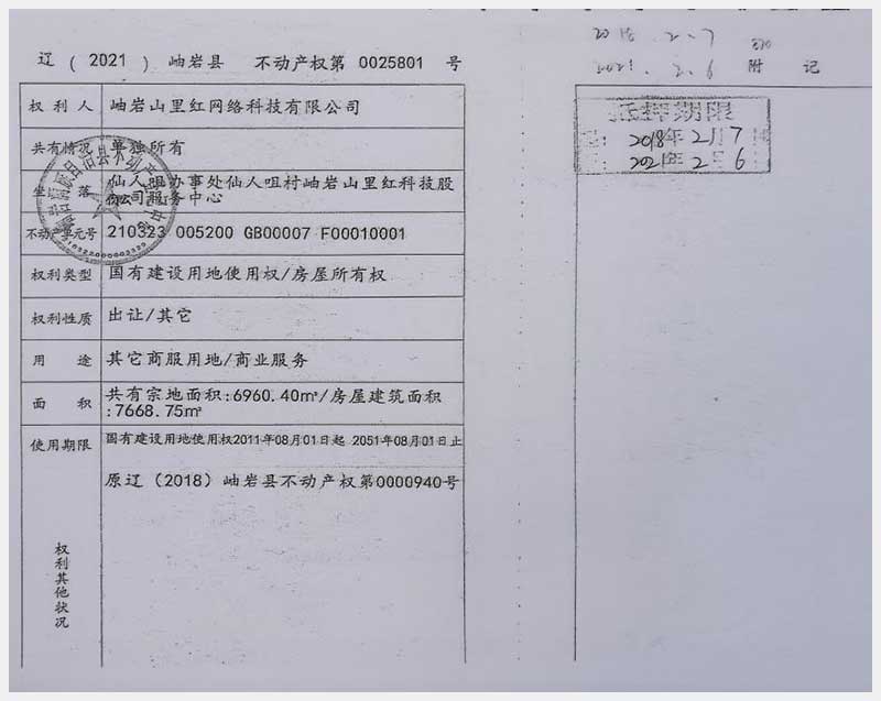名稱:岫巖滿族自治縣仙人咀辦事處仙人咀村房產(chǎn)及土地使用權(quán) 面積:房產(chǎn):38118.66㎡;土地:77446.8㎡ 瀏覽次數(shù):100