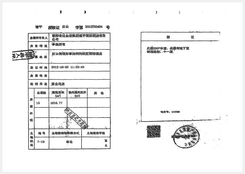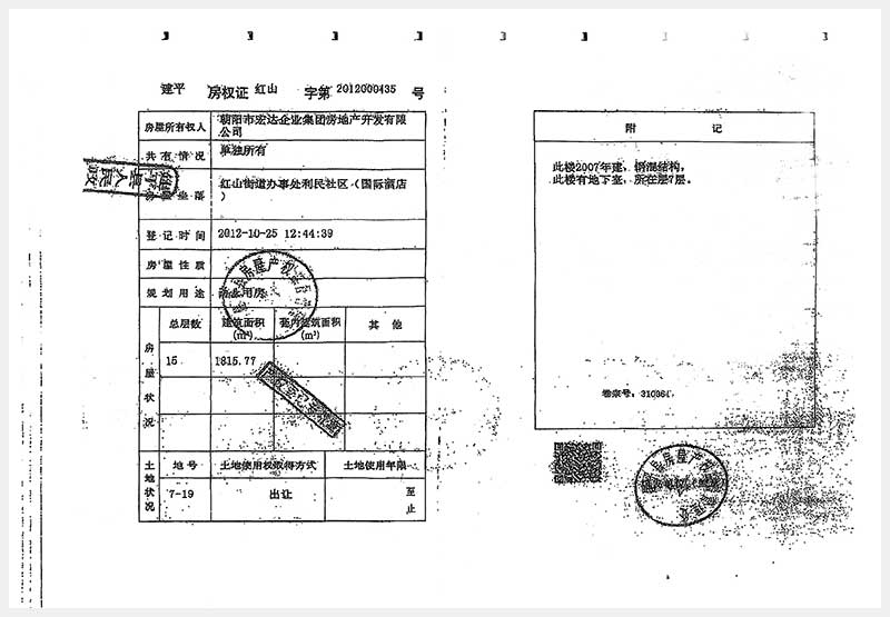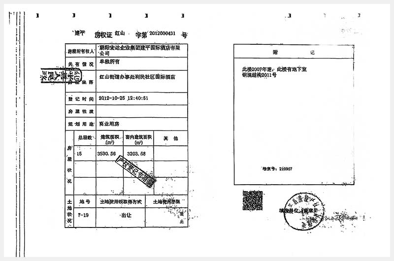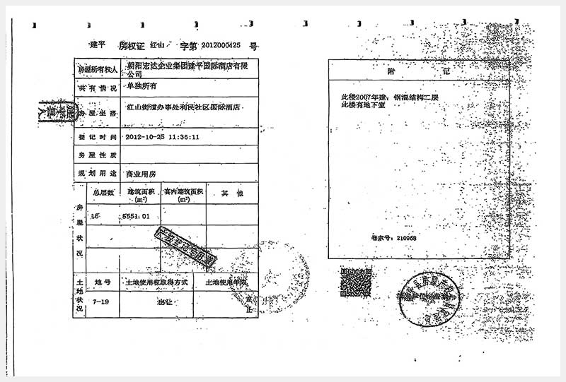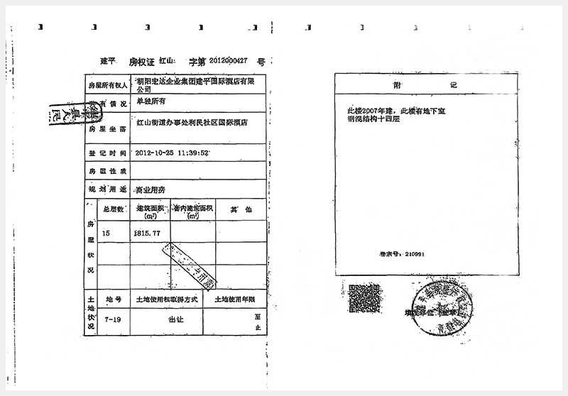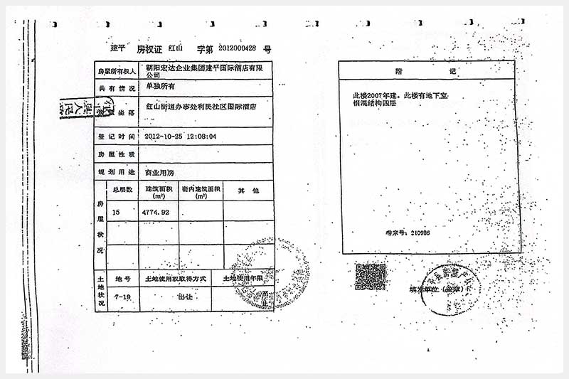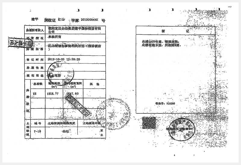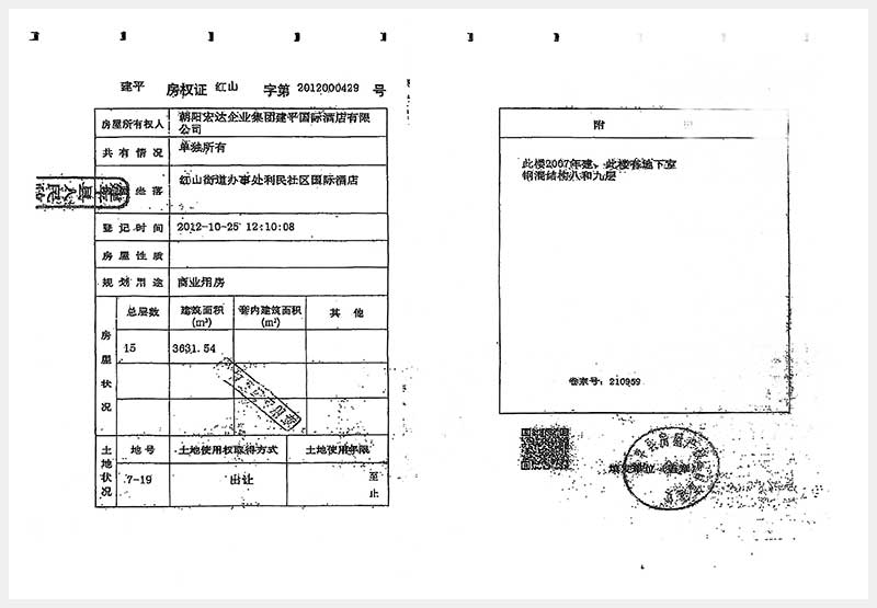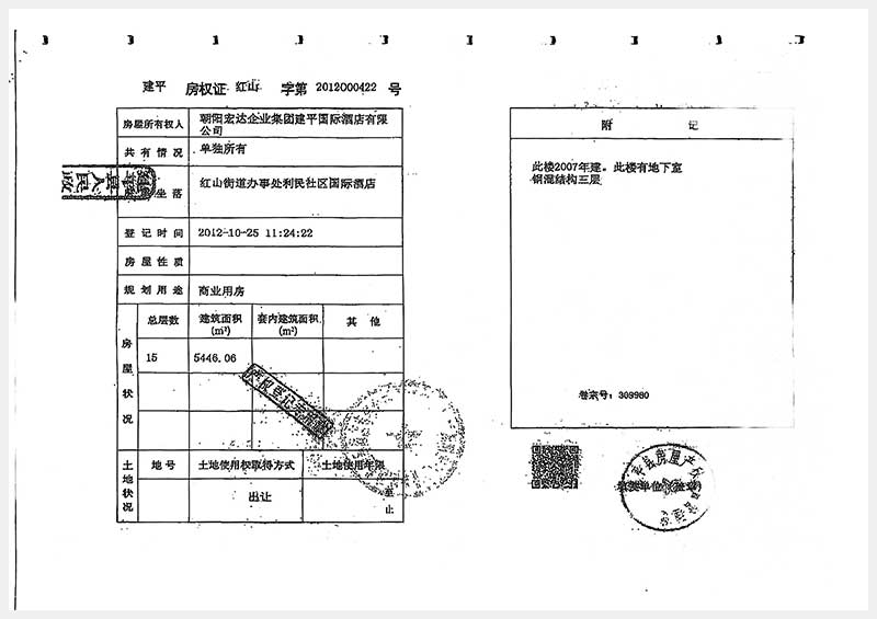 名稱:朝陽市建平縣紅山街道辦事處利民社區(qū)國際酒店房產及土地使用權 面積:房產:3802㎡;土地:2574㎡ 瀏覽次數(shù):130