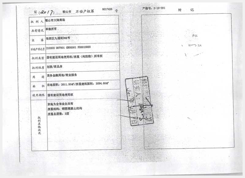 名稱:鞍山市鐵西區(qū)九道街368號房產(chǎn) 面積:3594.6㎡ 瀏覽次數(shù):984