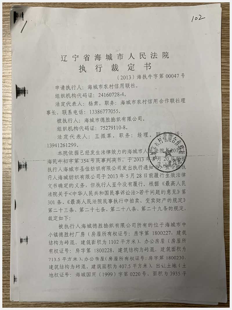 102號(hào) 海城市中小鎮(zhèn)德勝村房產(chǎn)及國有土地使用權(quán)