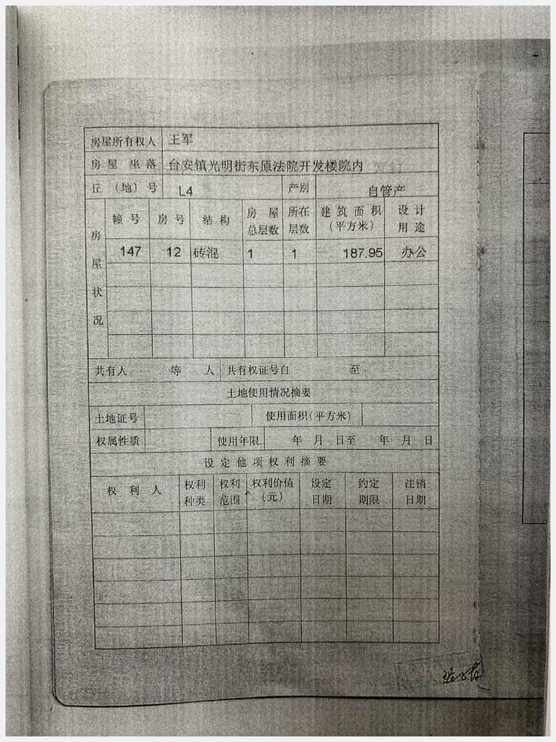 名稱:臺安鎮(zhèn)光明街東原法院開發(fā)樓院內(nèi)房產(chǎn) 面積:187.95㎡ 瀏覽次數(shù):1288